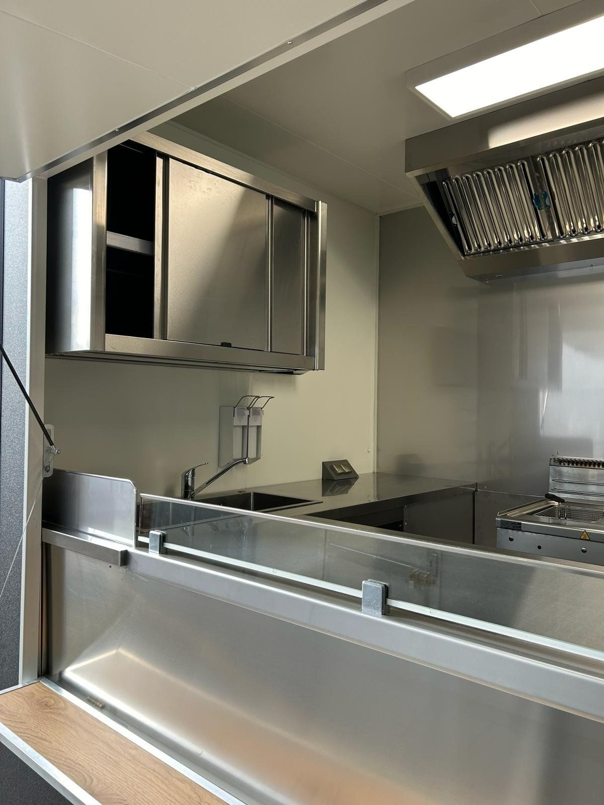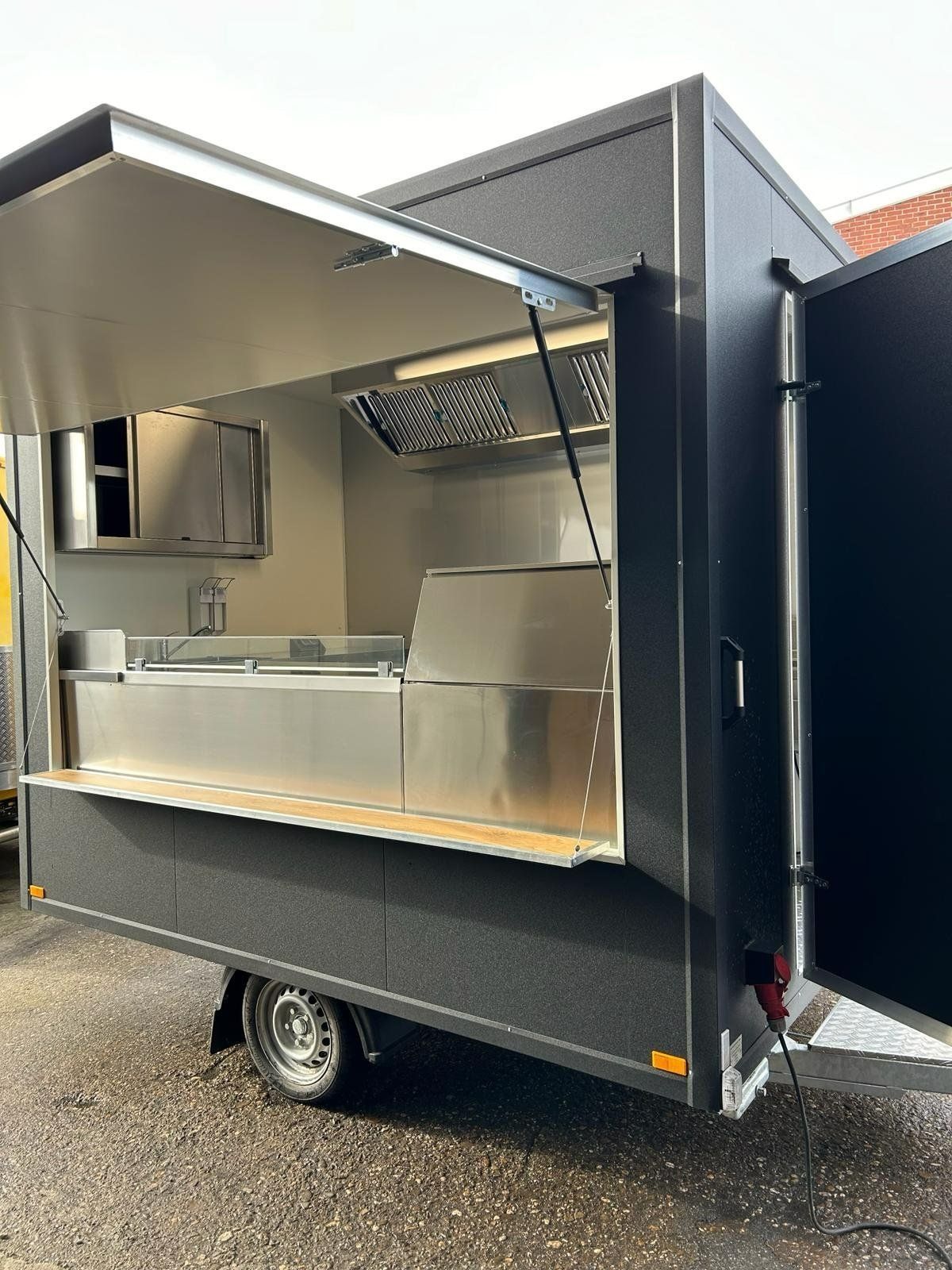 Basisfahrzeug: Neuer Verkaufsanhänger in Schwarz oder Weiß mit Verkaufsklappe, Türe und Gasschrank.